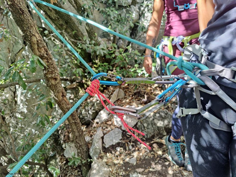 Am Mittwoch dann derRuhetag! Naja, Ruhetag im klettertechnischen Sinn. Erst stand unter anderem die Bergrettung auf dem Programm: Expressflaschenzug, Schweizer Flaschenzug und Körperhub oder mit Prusik am Seil aufsteigen. Beim Thema Sicherung an natürlichen Fixpunkten zeigte uns Steffi, dass zur Veranschaulichung auch der Einfallsreichtum einer*eines Trainer*in gefordert ist.