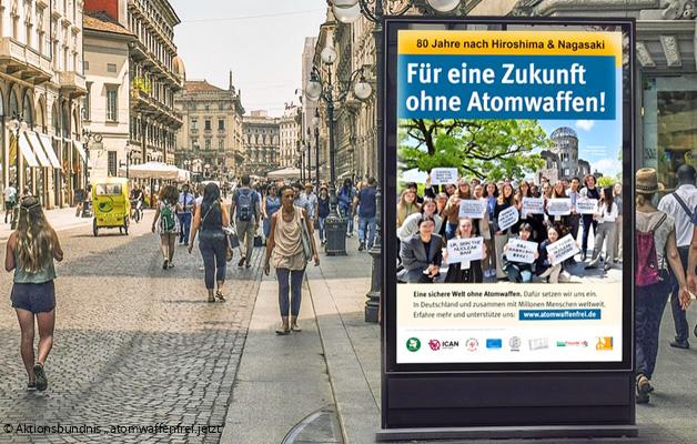 Die verheerenden Atombombenabwürfe auf die japanischen Städte Hiroshima und Nagasaki am 6. und 9. August 1945 jähren sich in diesem Jahr zum 80. Mal. Mit einer Plakataktion wird „atomwaffenfrei.jetzt“ – ein Aktionsbündnis, in dem sich auch die NaturFreunde Deutschlands engagieren – das Gedenken deutlich sichtbar ins Straßenbild von sechs deutschen Großstädten tragen, um auf die existenzielle Bedrohung durch Atomwaffen hinzuweisen.